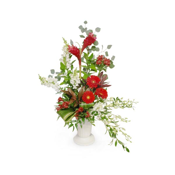 Pour offrir vos sympathies, avec délicatesse et élégance ce magnifique contenant est composé de fleurs de gingembre rouge, de gerbera rouge, de mufflier blanc éclatant, vous y trouverez également une touche de dendrobium blanc.