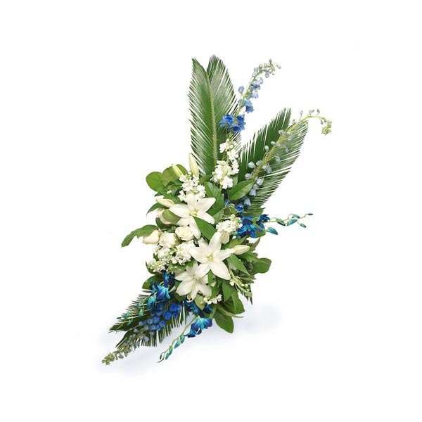 Cette majestueuse gerbe murale composée de lys blanc, de rose blanche et de dendrobium bleu le tout agrémenté d'un magnifique feuillage. Elle amènera paix et sérénité.